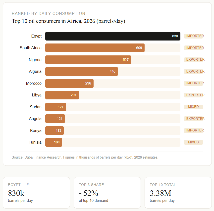 Together, the top 10 oil-consuming nations account for the vast majority of Africa’s total petroleum demand. Their rankings expose the economic weight of North Africa, the scale of sub-Saharan anchor economies, and the growing energy appetite of emerging markets — while also revealing how far per-capita consumption lags behind global peers.