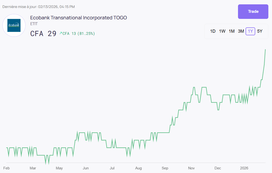 ETIT se négocie actuellement à 29 XOF après avoir clôturé à ce prix le 13 février 2026, ce qui représente une hausse de 26,1 % ou 27,7 % en USD depuis le début de l’année.
