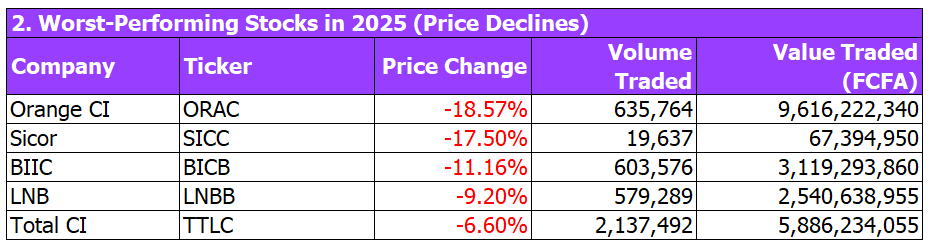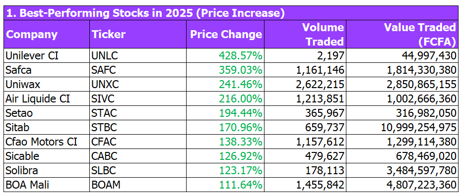 Companies like Unilever CI, Safca, Uniwax, Air Liquide CI, and Setao stood out with spectacular price appreciation, underscoring the power of long-term positioning in quality businesses.