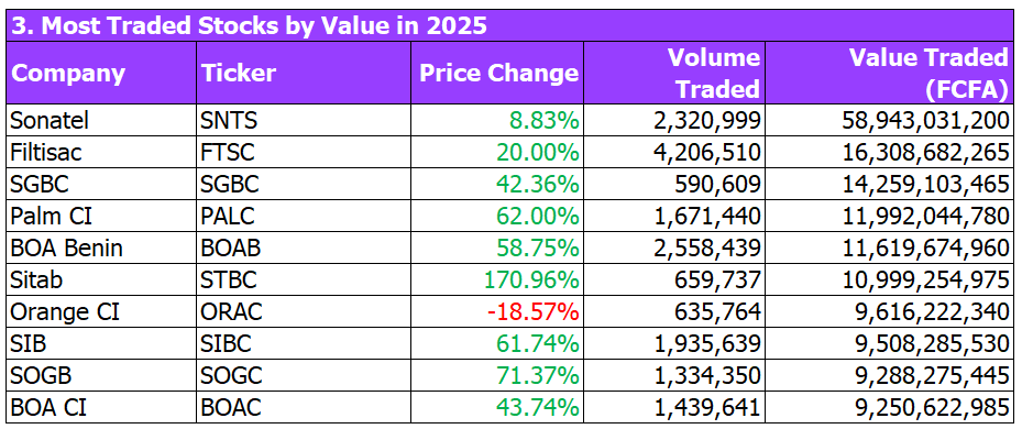 Trading activity remained concentrated in a small group of large-cap stocks, including Sonatel, Palm CI, BOA subsidiaries, and Orange CI. While liquidity improved overall, many smaller stocks remained thinly traded.