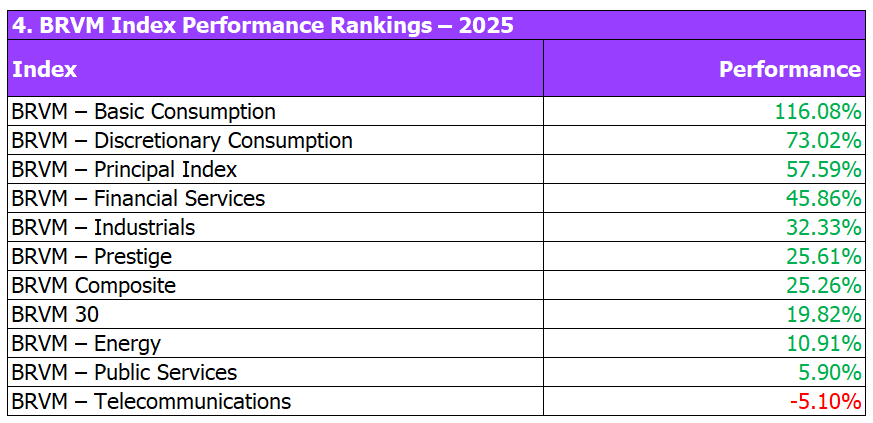 Sector indices told a similar story. Basic Consumption and Discretionary Consumption were the clear outperformers in 2025, reflecting resilient domestic demand across the region.