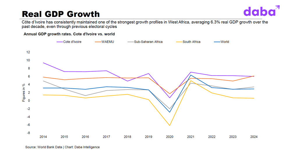 Over the past ten years, Côte d’Ivoire has grown at an average rate of 6.3% annually—faster than both Sub-Saharan Africa as a whole and major economies like South Africa.