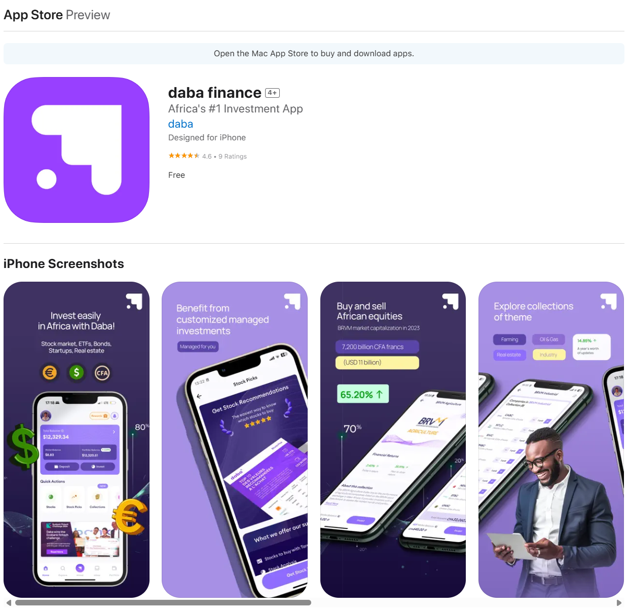 Lorsque vous recherchez “Daba Finance” sur le Play Store ou l’App Store, assurez-vous que l’application ressemble à celle-ci :